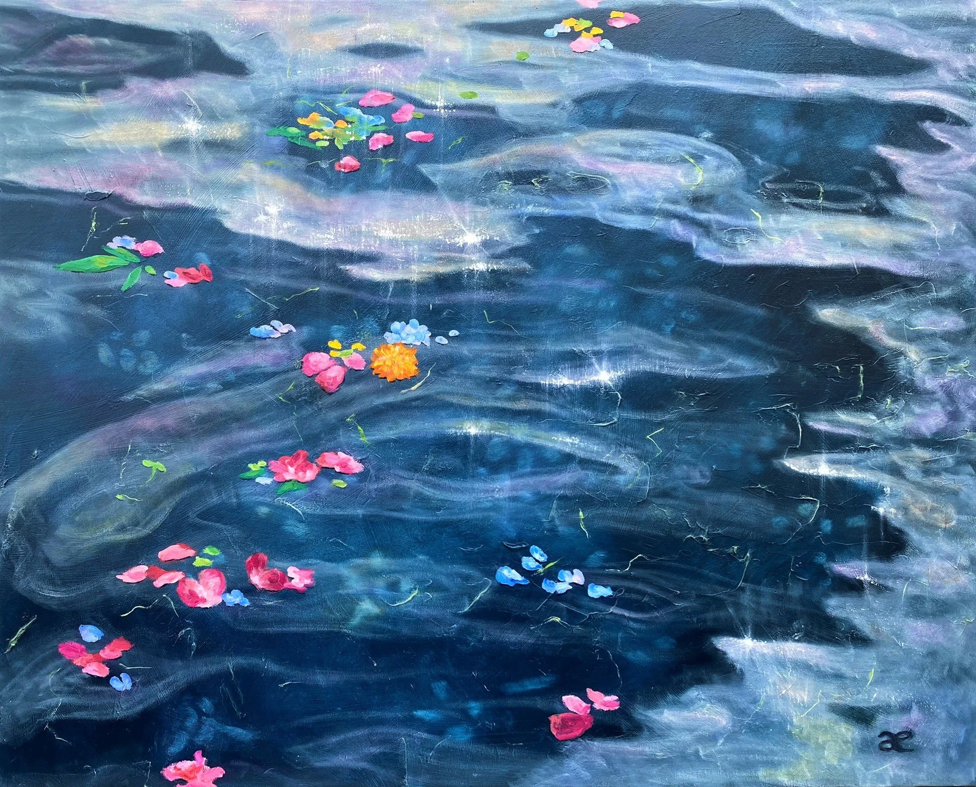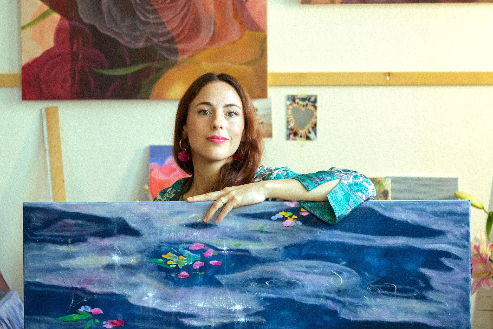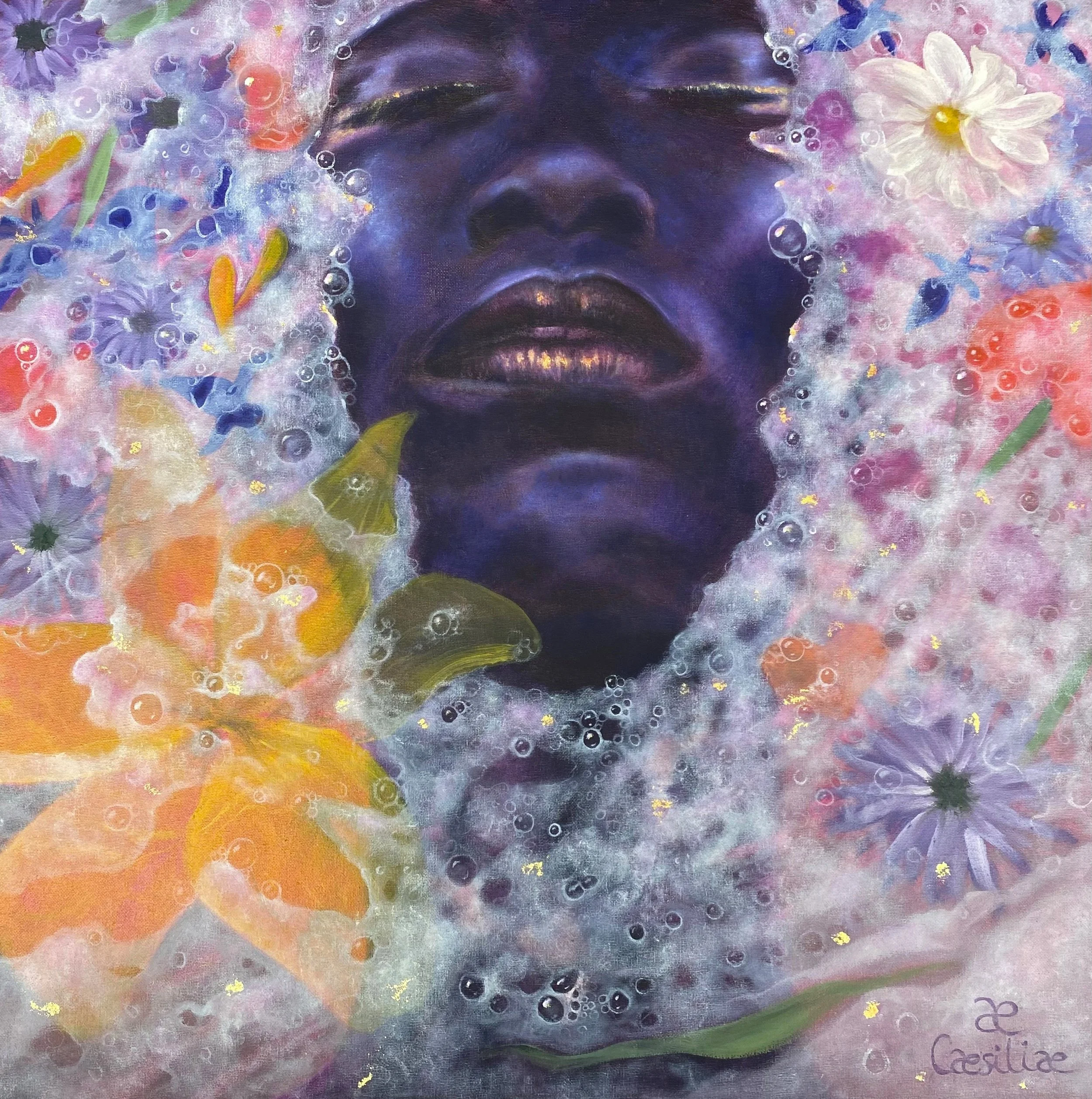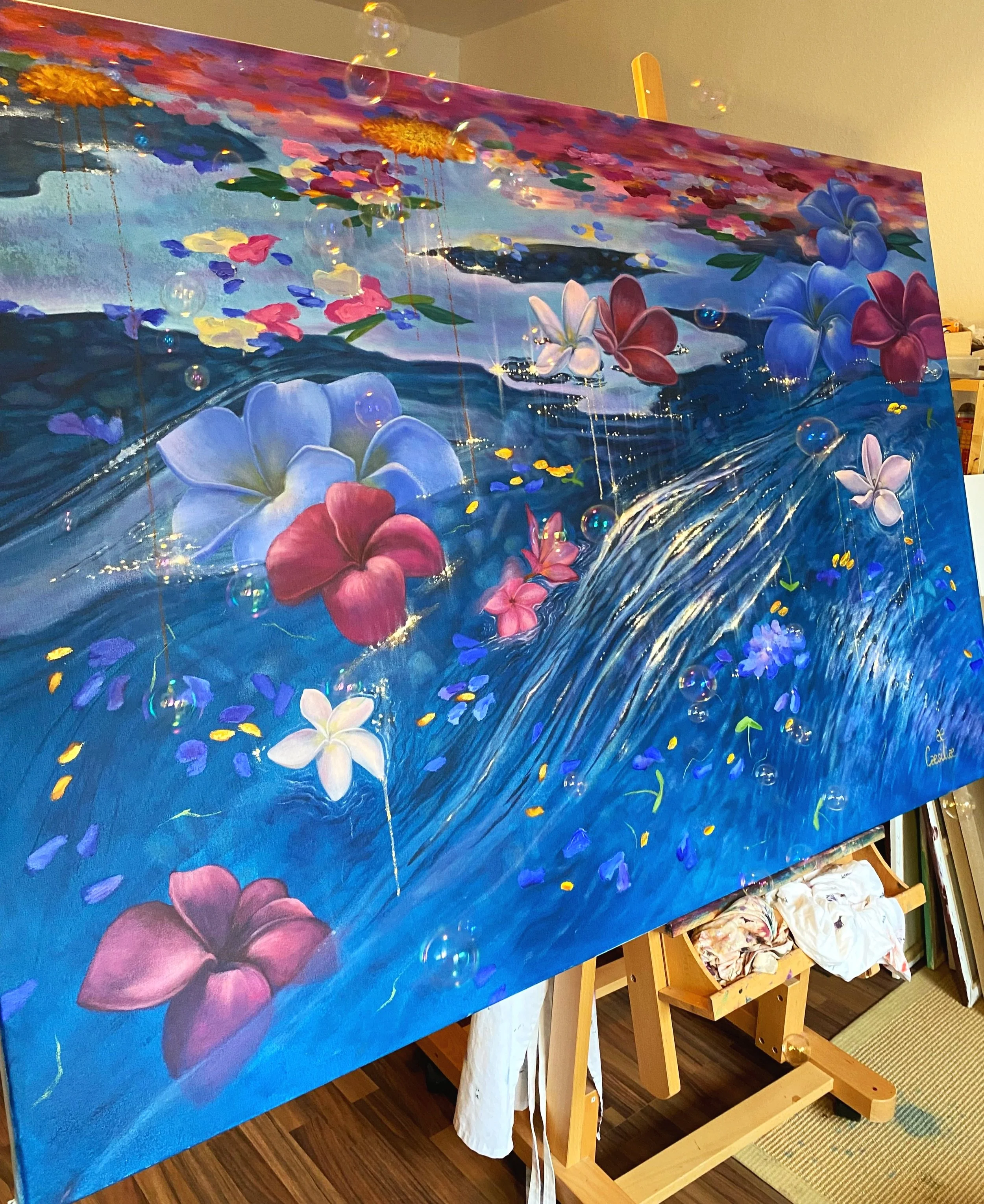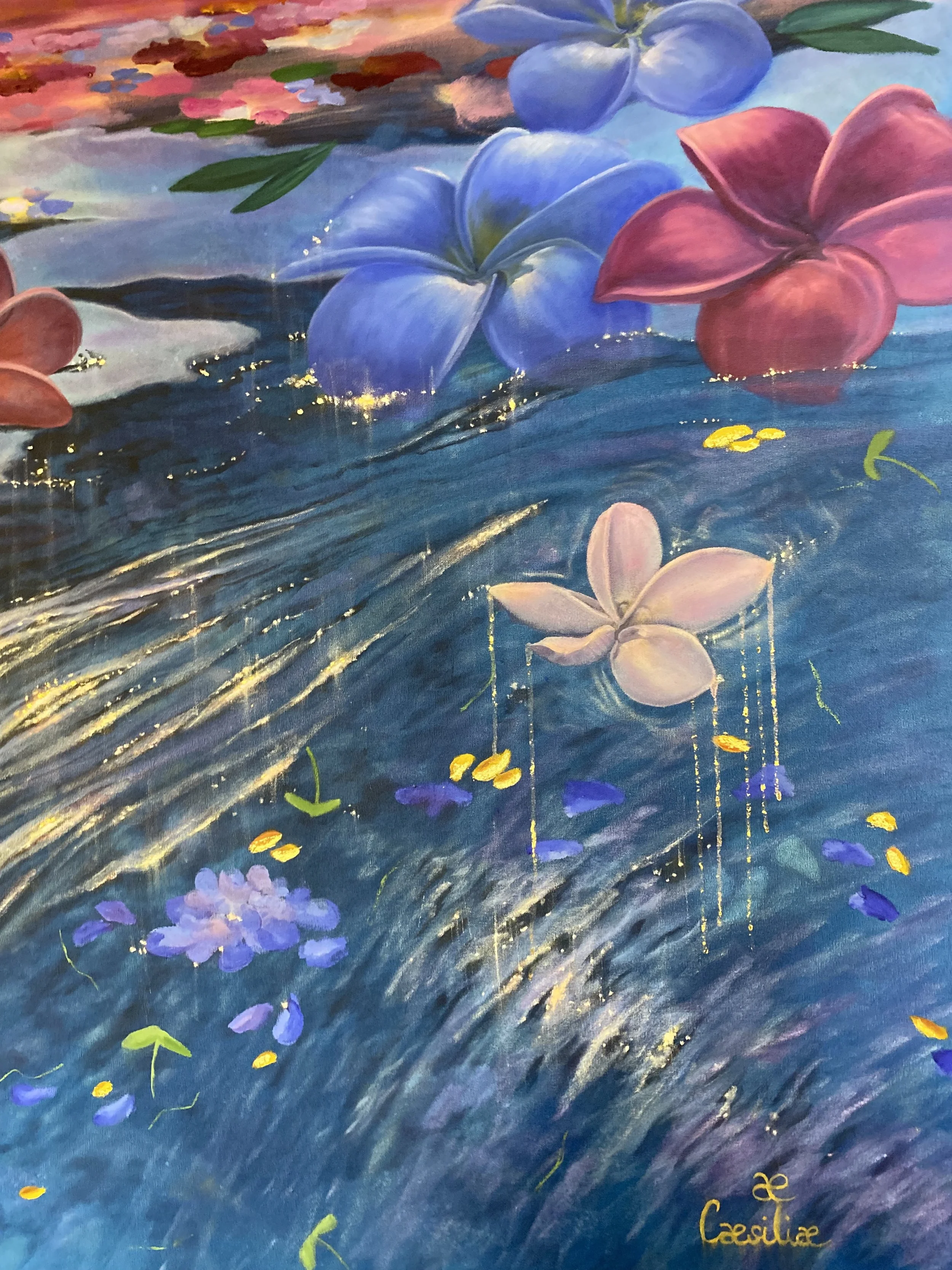 I have been inspired by visions of magical worlds. Memories of the beautiful gardens of my grand-mothers and of my mother, who passed away . A life time observing luminous reflexion on water. Spring in Berlin. Sacred temples in Bali. Bathing in bubbles and colorful fresh flowers. My nourished inner world and imagination. Becoming a mother and transforming deeply. Energy work journeys with enlightened female leaders. And women around the world who have come before, around and after me…