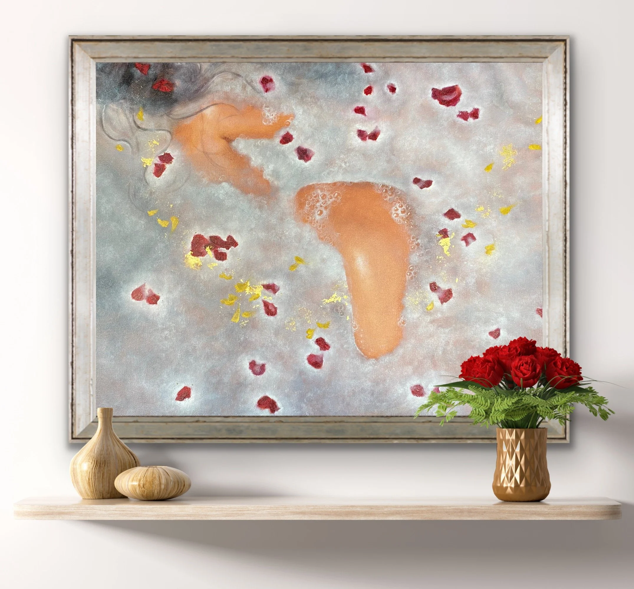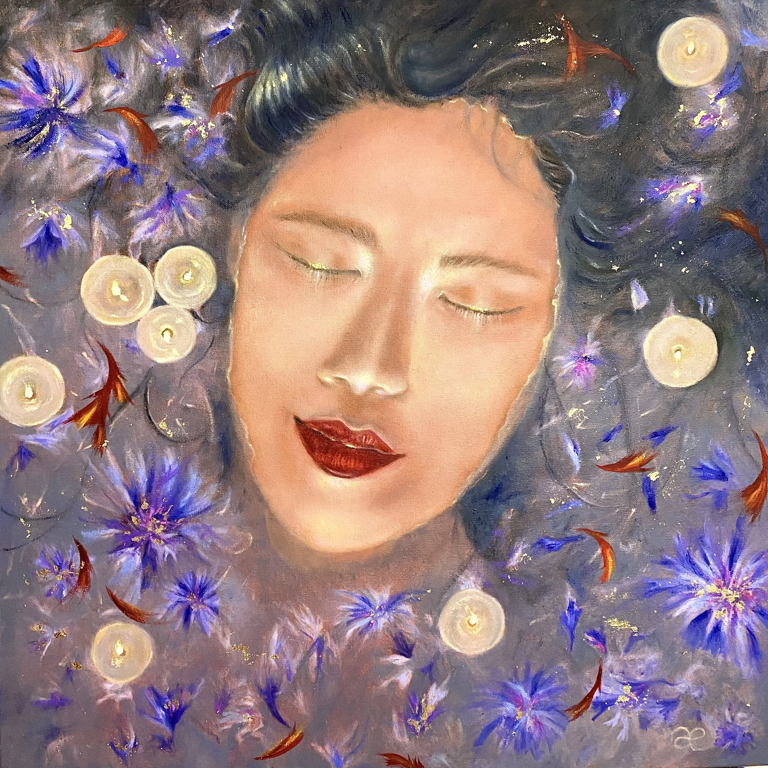 I start and finish each painting with a blessing and I paint on music. It helps me enter “the flow” and translate high frequencies, emotions and ideas into paintings. I created those pieces excusively with natural linseed oil, an odorless and sustainable medium, on high quality gallery canvas. I work in very thin and delicate layers which brings depth and transparancy to each piece. I apply 24 karat gold leaves at the final stage of a painting for a touch of evergreen elegance and long lasting beauty.